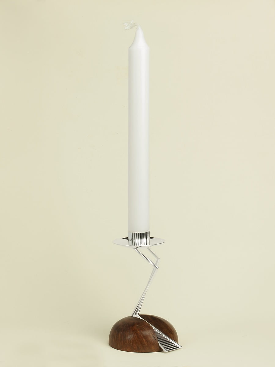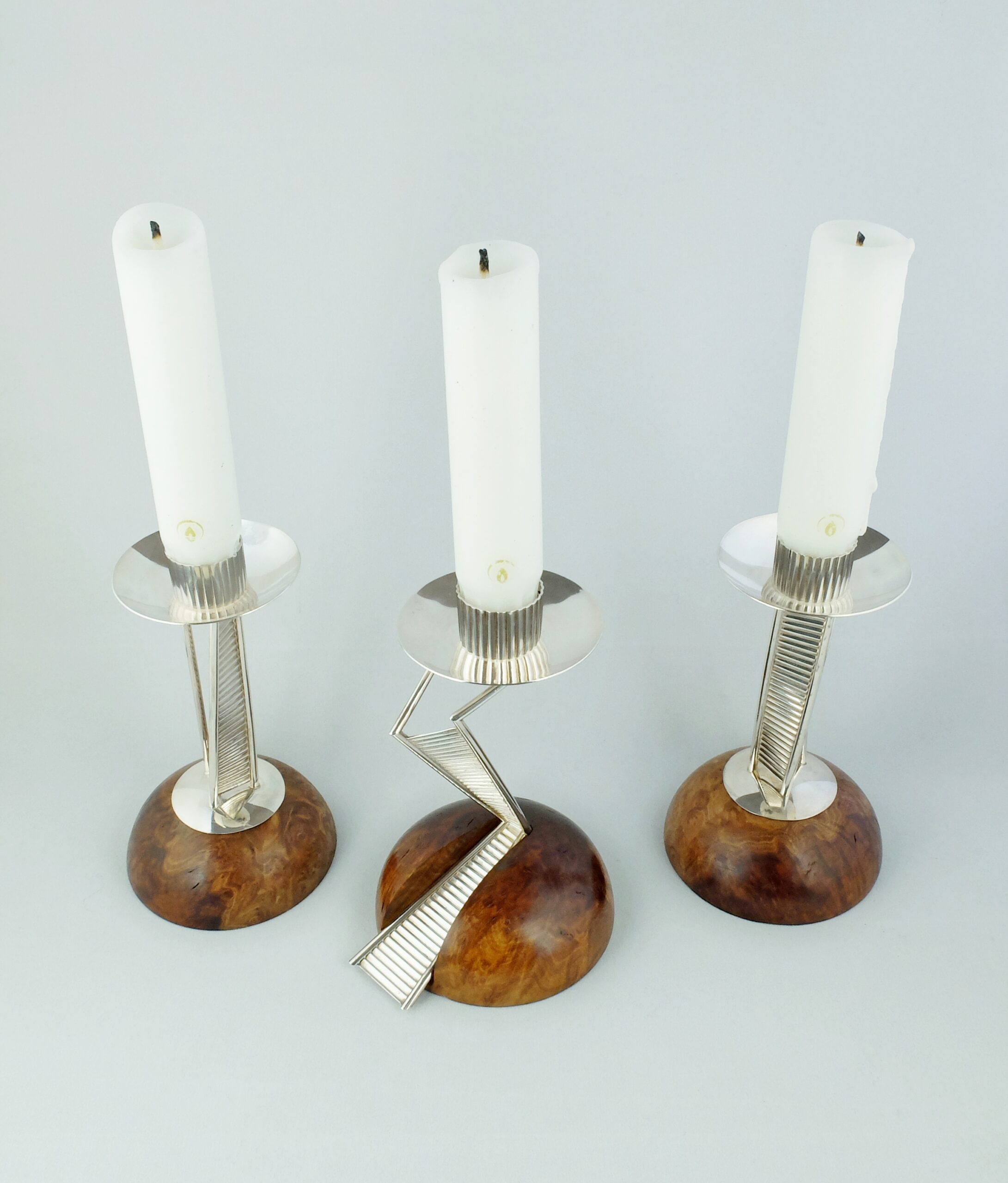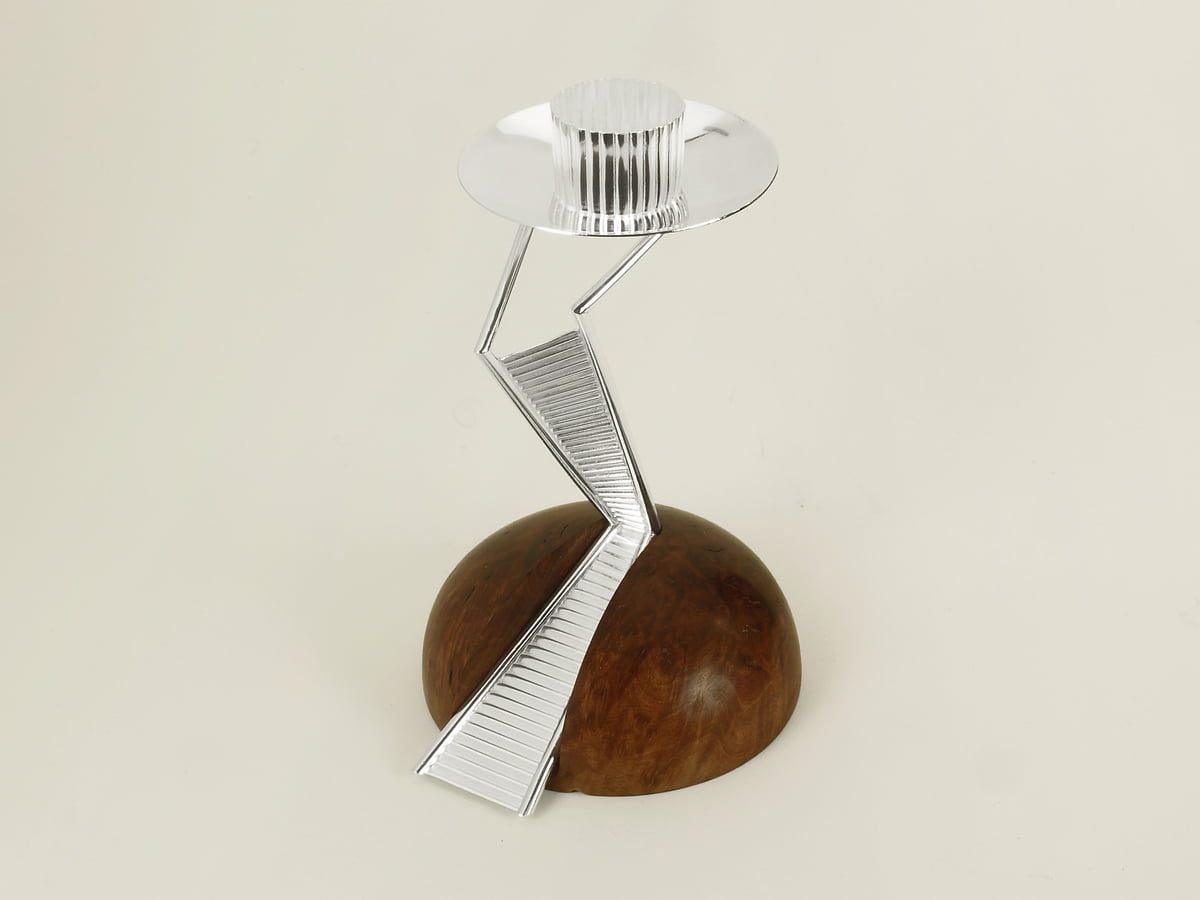 Kandelaars van zilver op een voet van eucalyptuswortelhout. Geïnspireerd op de communicatietoren van architect Calatrava