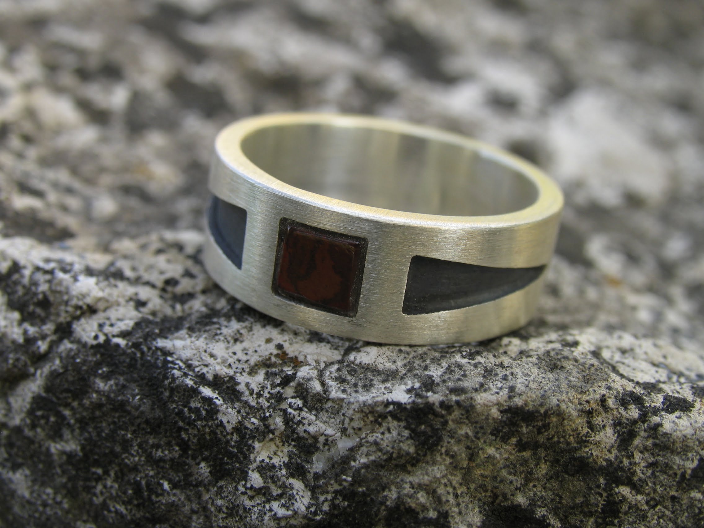 Ring zilver met jaspis. De ring is gemaakt met overlay techniek: twee lagen zilver op elkaar gesoldeerd waarbij in de buitenste ring een motief is uitgezaagd. Bij het afwerken wordt het diepliggende deel gezwart met een sterk oxiderende vloeistof.